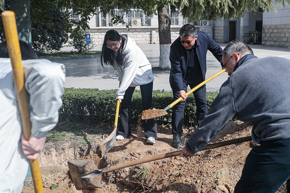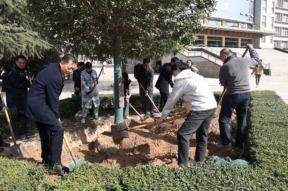 春回大地万物苏,植树添绿正当时。为深入贯彻习近平生态文明思想、特别是习近平总书记关于全民义务植树重要指示精神,进一步绿化美化校园,营造校园爱绿植绿、护绿兴绿的浓厚氛围,3月12日,时值第46个全民义务植树节之际,校党委书记赵万东,校长王长顺,校党委副书记袁也、周群英,党委副书记、纪委书记、监察专员赵效恩,副校长毛龙灿与部分师生一起参加义务植树活动。