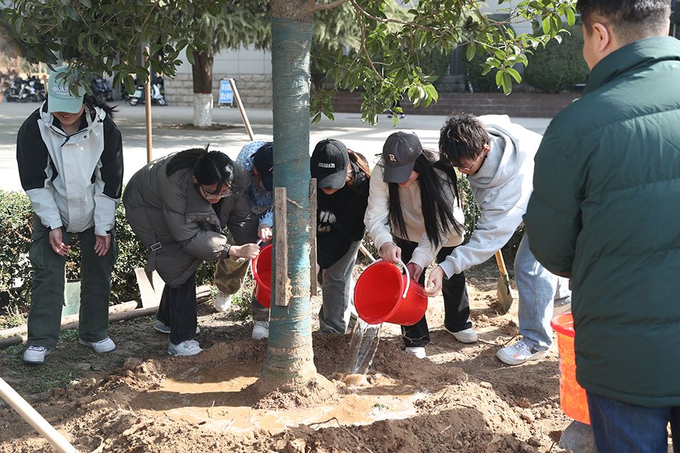 植树现场,校领导身体力行,和参加植树的师生分工协作,默契配合,扶苗、培土、踩实、浇水,在一片紧张忙碌中,一棵棵新栽的苗木在美丽校园昂然挺立。