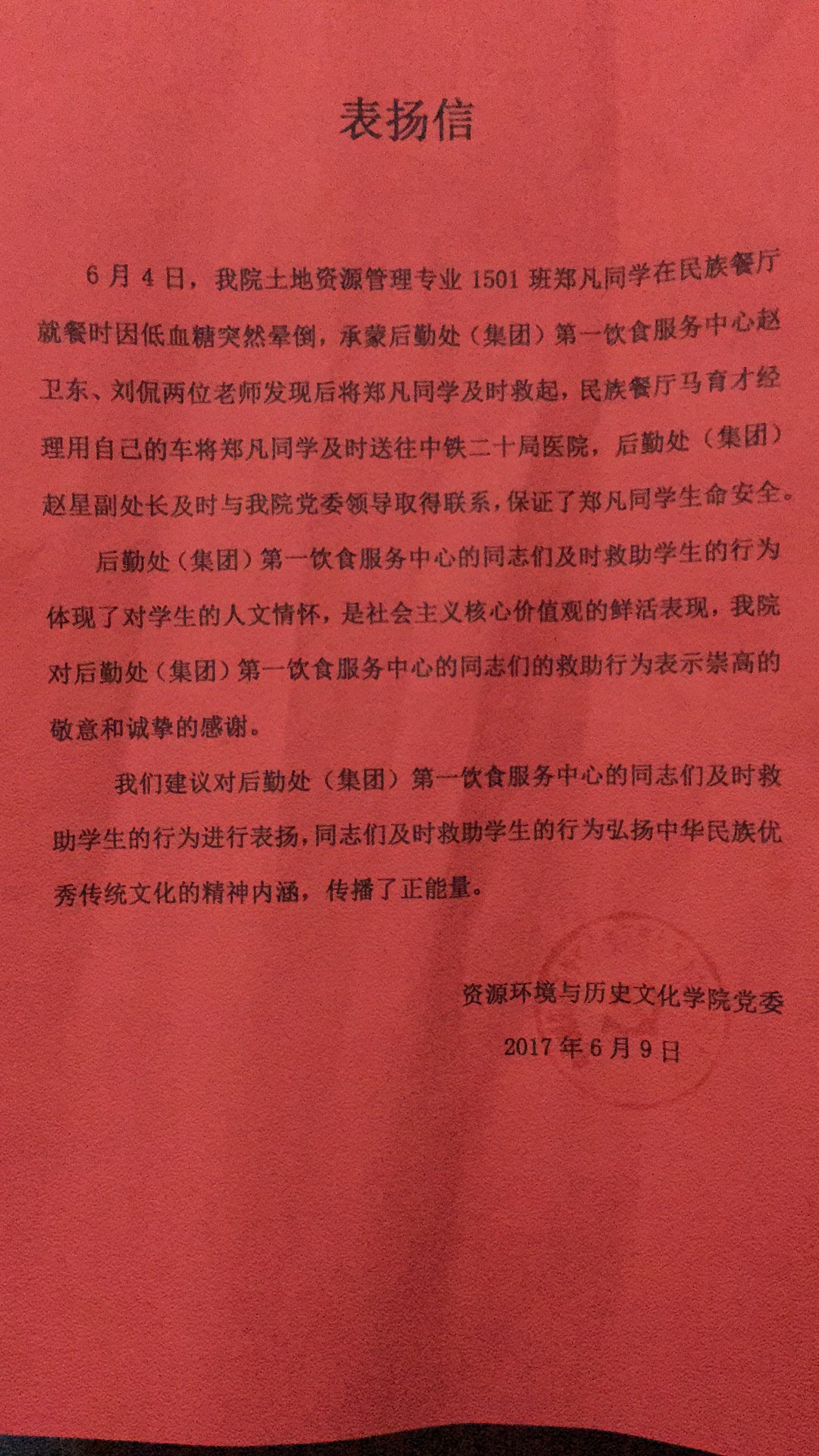 12日上午,该学生满怀感激,为民族餐厅送来锦旗、感谢信,资源环境与历史文化学院党委给后勤处发来表扬信。接到锦旗的时候,餐厅经理马育才说:“在任何时候遇到需要帮助的人,我们都会尽力去帮忙的。”