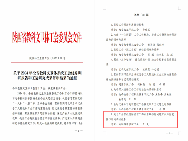 近日,省教科文卫体工会委员会印发《关于2024年全省教科文卫体系统工会优秀调研报告和工运研究成果评审结果的通报》(陕教科文卫体工发〔2025〕17 号)并公布获奖名单。taptap点点职业技术学院(秦都书院)王曼撰写的《关于工会在扎实解决职工群众急难愁盼问题方面如何发挥作用的调研报告》荣获三等奖。