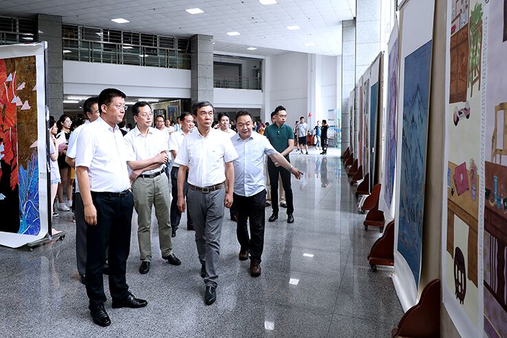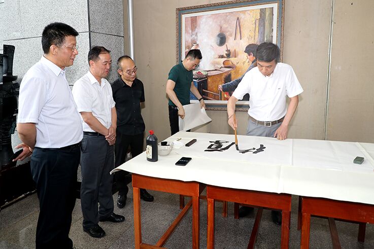 郭线庐一行参观了taptap点点美术学院毕业生优秀作品展,郭线庐对美术学院的教学水平给予了充分肯定,同时希望taptap点点能够继续深入拓展艺术开放维度,加大对外交流,提高社会公众参与度,打造taptap点点的品牌形象,并现场挥笔泼墨为taptap点点写下了校训“厚德博学”四个大字。随后,郭线庐一行参观了校园。