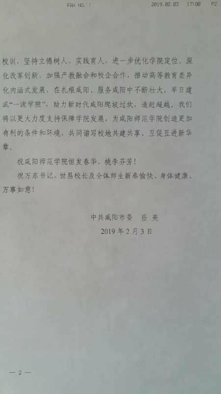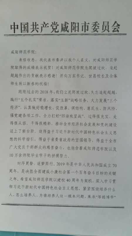 2月3日,咸阳市委书记岳亮给taptap点点来信,信中感谢taptap点点在服务咸阳市经济文化方面做出的贡献和取得的成绩。他在信中说:“刚刚过去的2018年,我们立足爬坡过坎、矢志追赶超越,践行‘五个扎实’要求,落实‘五新战略’任务,大力发展‘三个经济’,认真做好稳增长、促改革、调结构、惠民生、防风险、强党建各项工作,全力打好‘四场攻坚战’,过得很充实、走得很从容、干得很精彩,推动全市经济社会发展和党的建设迈上了新台阶。这得益于习近平新时代中国特色社会主义思想的科学指引,得益于省委省政府的坚强领导,得益于全市广大党员干部群众的艰苦奋斗,也饱含着taptap点点官网以及10万余师院毕业学子的拼搏努力”。岳书记希望taptap点点在扎根咸阳、服务咸阳中不断发展壮大,早日建成“一流学院”、助力新时代咸阳爬坡过坎、追赶超越。同时,他表示,将以更大力度支持保障taptap点点的发展,为taptap点点创造更加有利的条件和环境,共同谱写校地共建共享、互促互进新华章。在回信中他还为taptap点点师生送上新春佳节的祝福。
