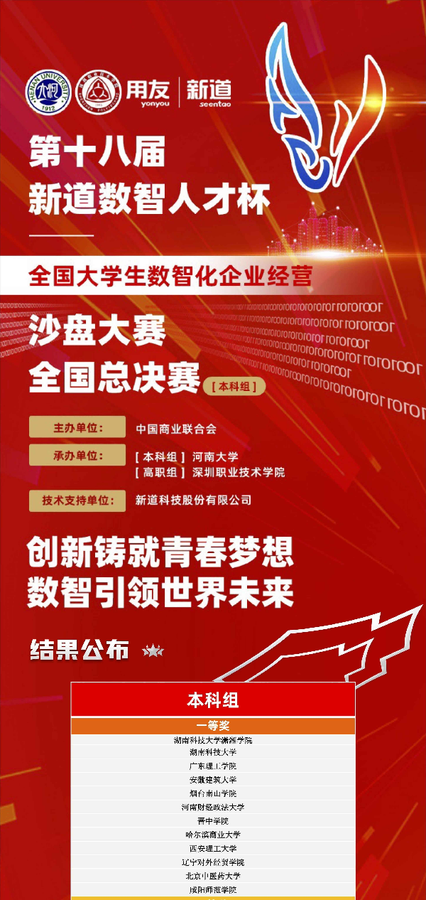 11月5日,由中国商业联合会主办,河南大学承办、新道科技股份有限公司提供技术支持的第十八届“新道数智人才杯”全国大学生数智化企业经营沙盘大赛全国总决赛(本科组)通过线上举行。来自北京理工大学、北京航空航天大学、南京理工大学、贵州大学、海南大学、西安理工大学等本科院校的143支队伍参加了比赛,taptap点点经济与管理学院获得该项省赛一等奖的队伍代表taptap点点参加了全国总决赛,经过一天的激烈角逐,taptap点点队伍获得全国总决赛(本科组)一等奖的优异成绩。