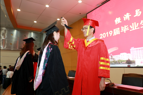 学位授予仪式在庄严肃穆的奏唱国歌中拉开序幕,首先,经济与管理学院副院长罗利丽教授宣读《关于准予2019届毕业生赵瑶瑶等4115名同学毕业的决定 》、《关于授予2019届本科毕业生学士学位的决定》;杨生博教授宣读《关于表彰学院2019届优秀毕业生、优秀毕业生干部的决定》;邵忍丽教授宣读《关于表彰2019届考取硕士研究生毕业生的决定》。随后,校领导及我院教授为325名毕业生一一拨穗,颁发学士学位证书,并为我院优秀毕业生、优秀毕业生干部、考取研究生学生颁奖。