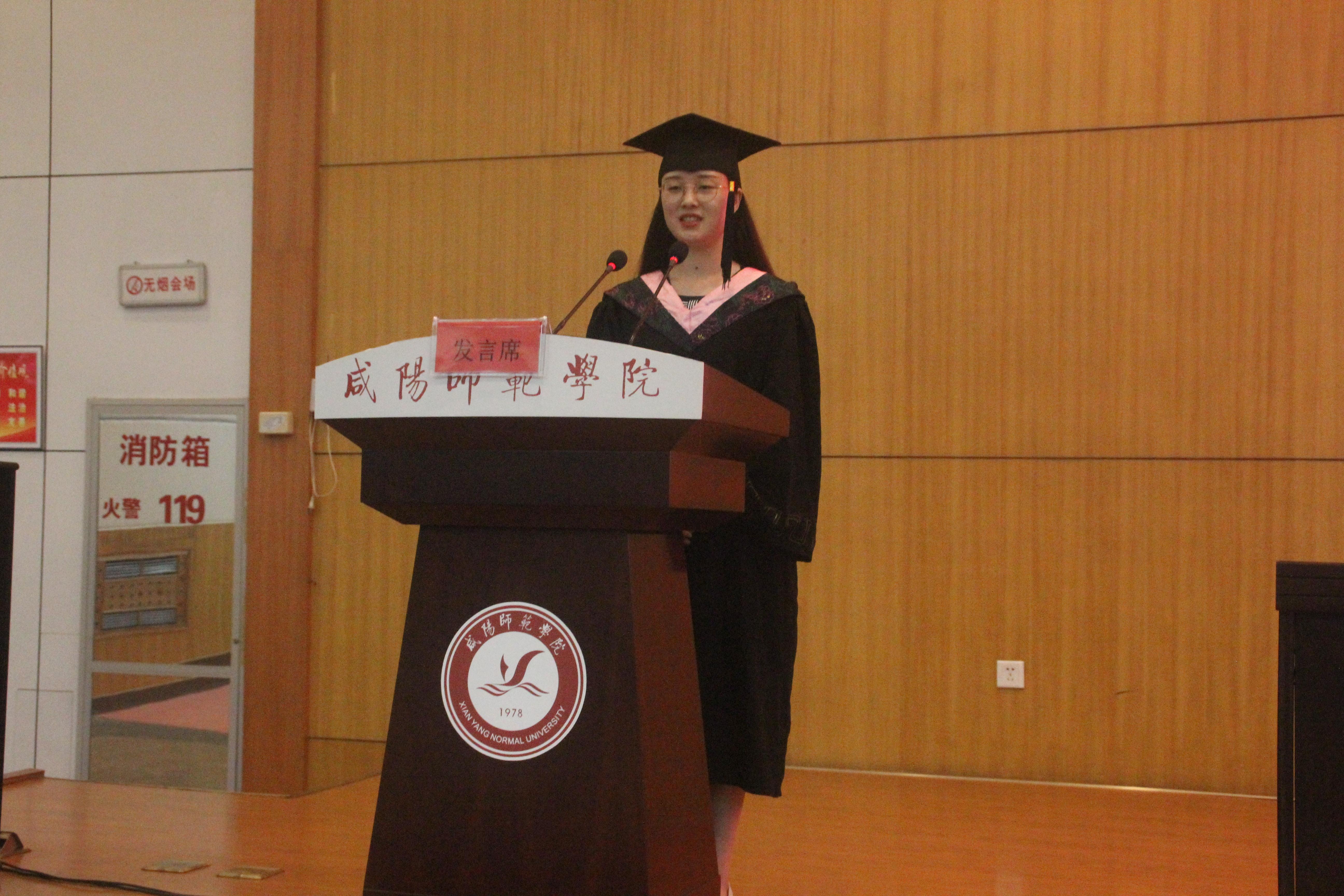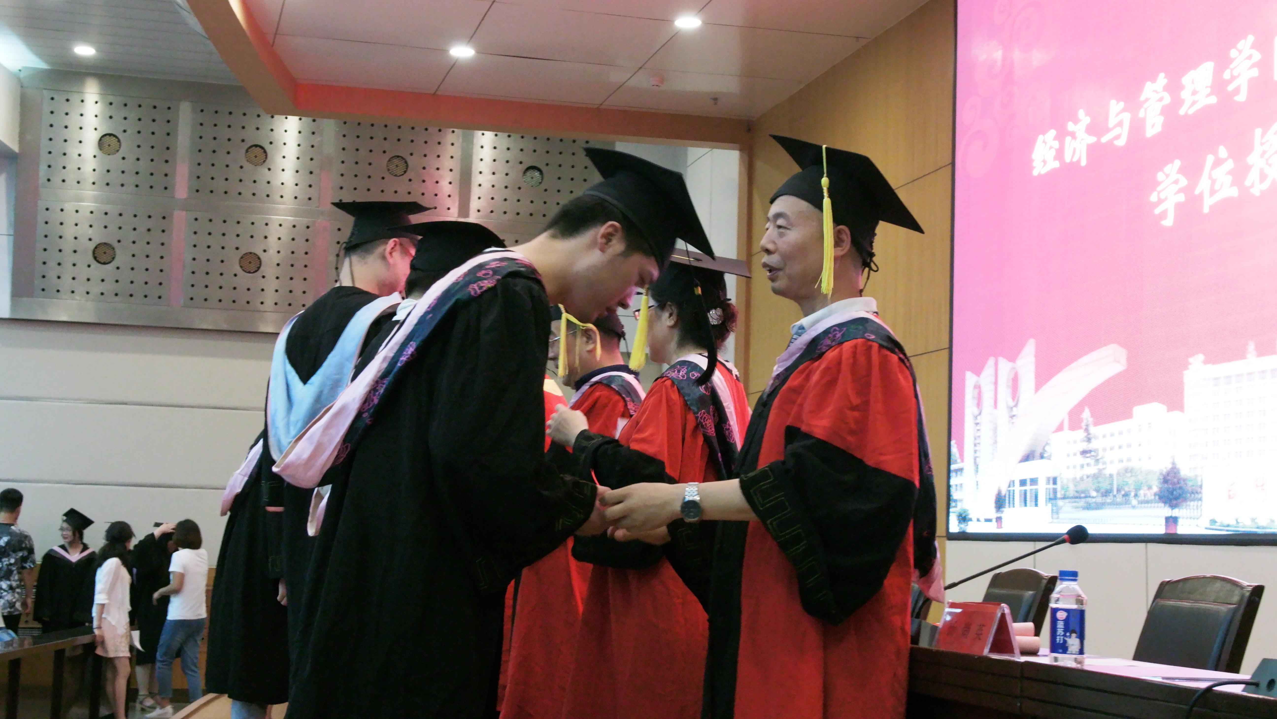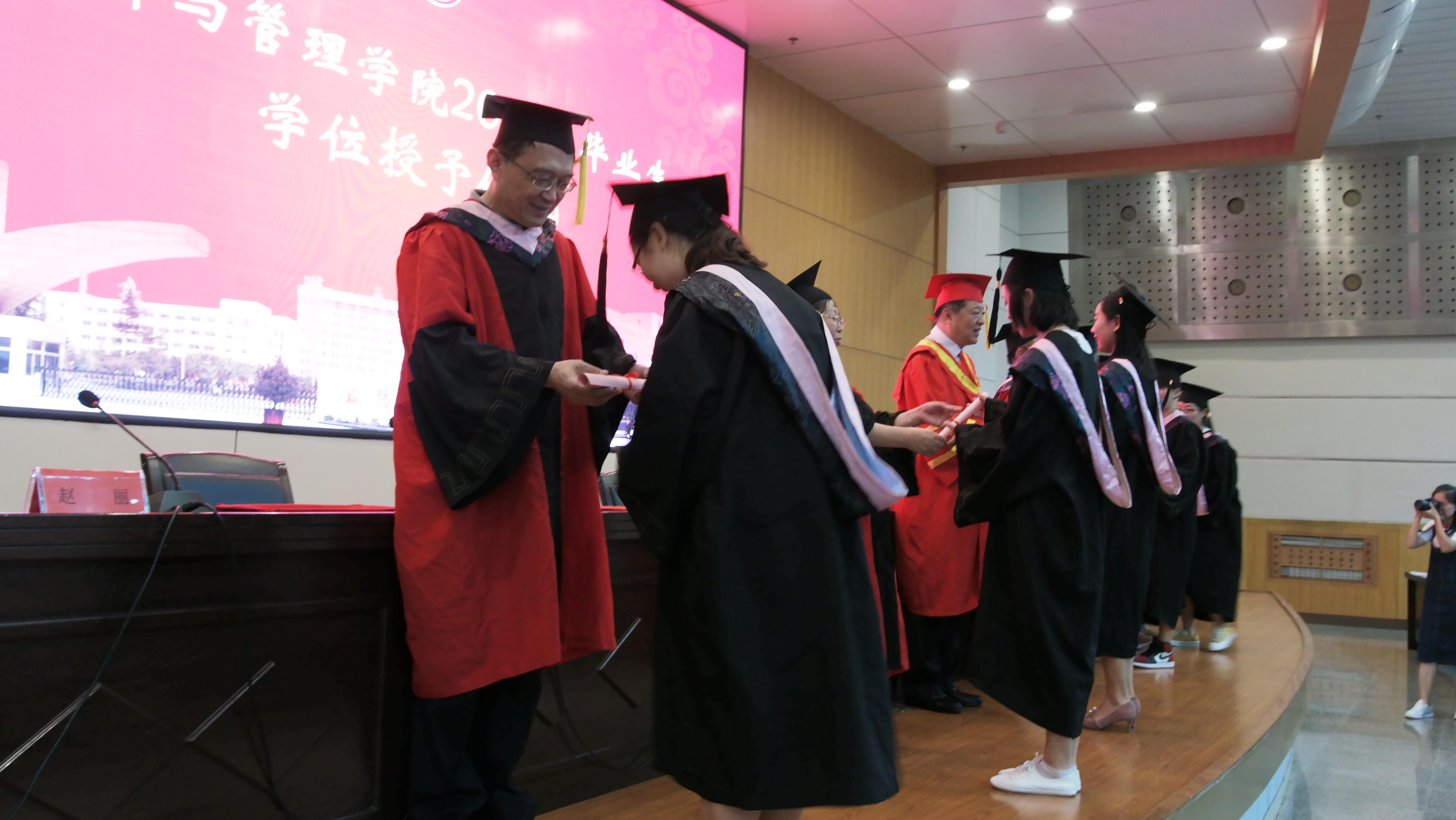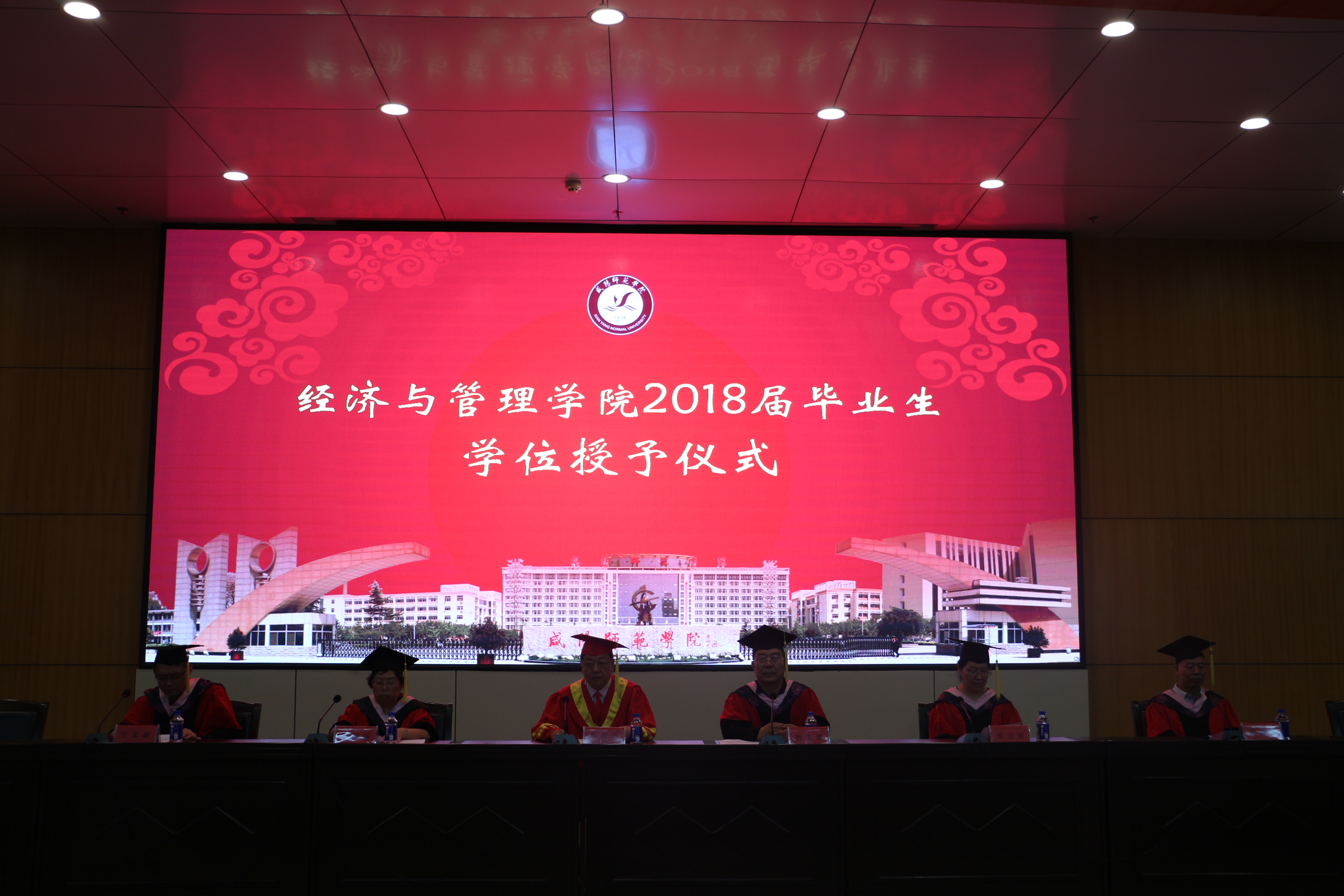 仪式在庄严的国歌声中拉开帷幕,学院副院长罗利丽教授宣读了《关于授予2018届本科毕业生张谦、刘文静等362名学生学士学位的决议》。马智勇研究员、吕家麟教授、杨生博教授、罗利丽教授、杨尚英教授、邵忍丽教授等为毕业生颁发学位证书并拨苏正冠。杨生博院长作了重要讲话,在讲话中对全体毕业生顺利完成学业表示热烈的祝贺,寄语毕业生:一,人生需要纯洁剂,文学和艺术美学的阅读会清理思想运转中的污垢;二,要有一双飞往蓝天的翅膀,有比生命还重要的信念,要眼前开阔、霞光灿烂;三,要有一颗善良的心,扬善抑恶是人一生的使命,善的韵味无限,正是这种感觉,人才对生命寄予无限的向往和追求!在校生代表经济学1603班王一璇在发言中对学姐、学长长期以来的关心和帮助表示衷心地感谢,盼望学姐、学兄在自己的岗位上大显身手,为母校争光。毕业生代表旅游管理1401班刘阳在发言中回忆了4年美好的大学时光,对4年来老师对他们的教育和培养表示深深地感谢,并表示在今后的人生道路上,永远牢记老师的谆谆教诲,为学院添彩。