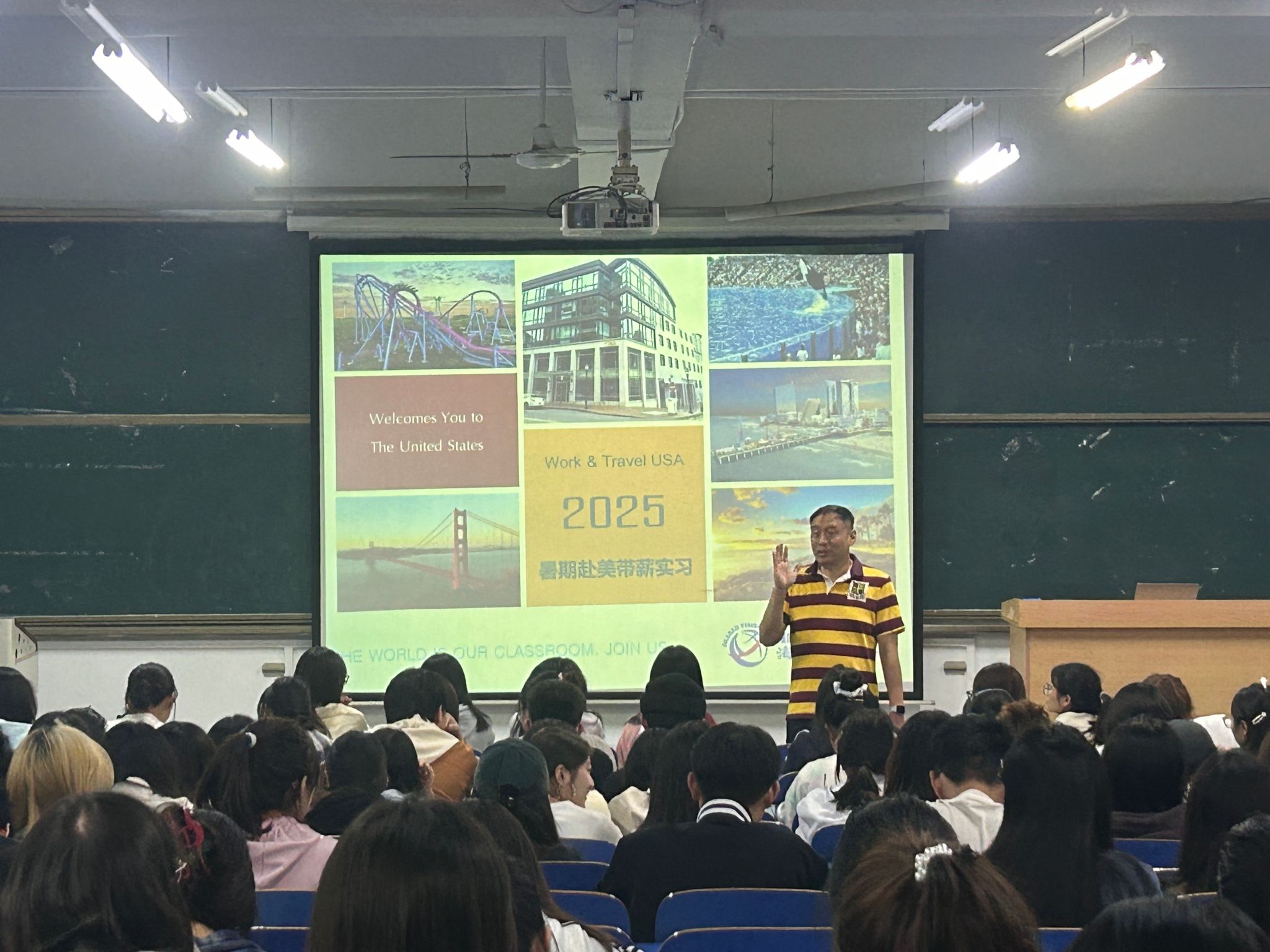 会上,王老师对赴美带薪实习的优势进行了全面分析,他依次介绍了“赴美实习”的岗位类型、住宿条件、薪资待遇、申请报名的流程以及各项目具体收费等方面的信息,并就该项目的合法性、安全性做出详细介绍,他鼓励同学们走出国门,放眼世界,通过出国丰富自己的人生阅历,成为一个全面发展的大学生。随后,外国语学院2022级吴良凤同学分享了自己赴美实习的经历,向同学们讲述了在美国的工作、生活日常,以及实习过程中的感悟。