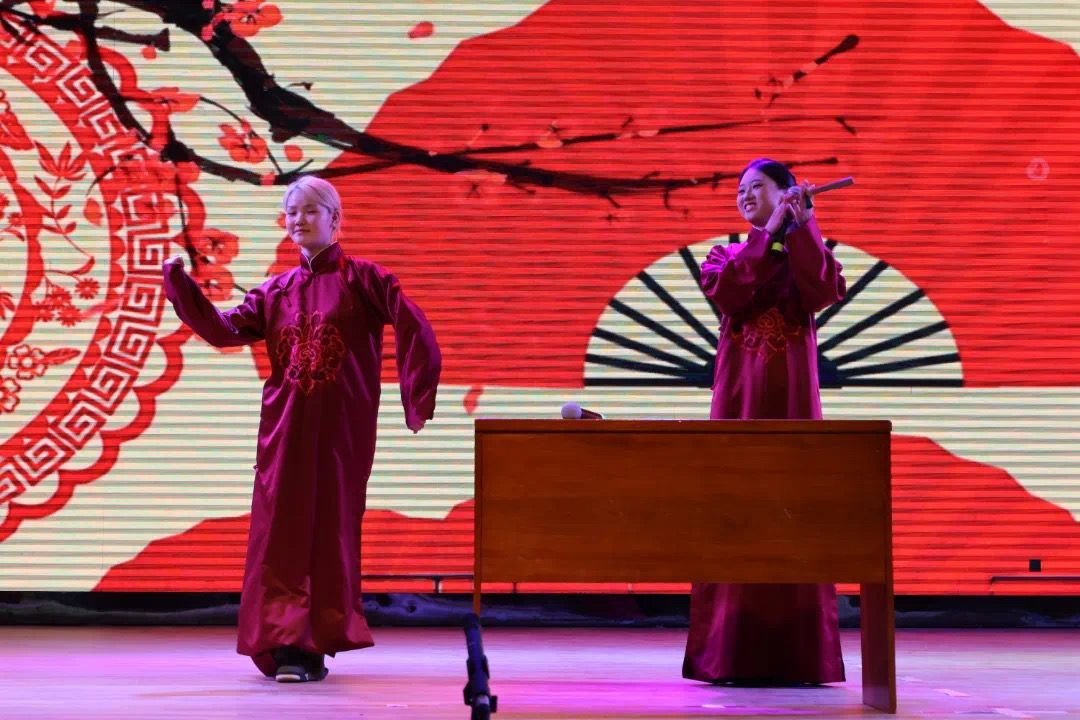 晚会在活力四射的开场舞中拉开帷幕,舞者们动感的舞姿瞬间点燃了全场的热情,台下掌声雷动。整台晚会节目形式多样,精彩纷呈。有悠扬动听的琵琶、古筝独奏,表演者用天籁之音征服了观众的耳朵,让大家沉浸在美妙的古典音乐世界;也有诙谐幽默的相声、小品表演,演员们凭借精湛的演技,将生活中的点滴趣事搬上舞台,台下观众捧腹大笑,笑声回荡在演播厅的每一个角落;还有激情澎湃的诗歌朗诵《风华》,诵出了同学们对新年的憧憬与向往以及对学院发展的美好祝愿。晚会在全体演员合唱《我们的明天》歌曲中落下帷幕。