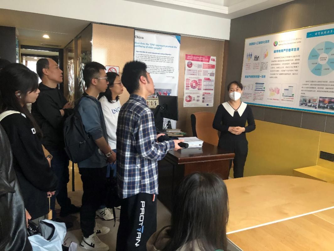 西关街道社工站负责人在向同学们讲解社会工作五社联动的具体内容和实际意义