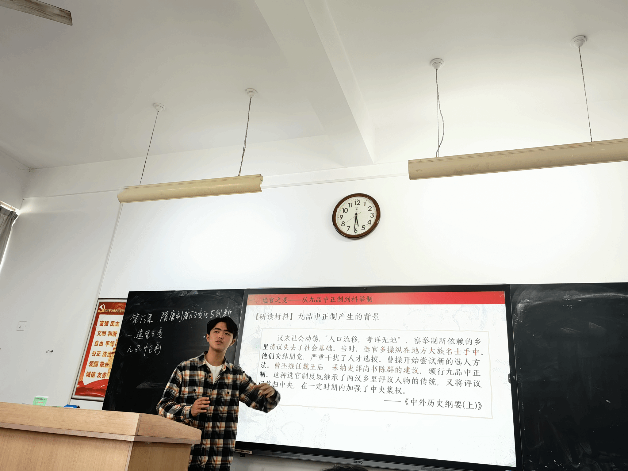 选手们围绕初高中历史课程标准,选手们进行了10分钟微课教学展示,课题涵盖《欧洲的思想解放运动》《隋唐制度的变化与创新》《五四运动》《经济体制改革》等多个主题。整个比赛过程中,选手们教态自然、语言流畅、逻辑清晰,能运用多媒体与板书相结合的教学手段,展现出扎实的学科知识储备、精心的教学设计与良好的课堂驾驭能力。