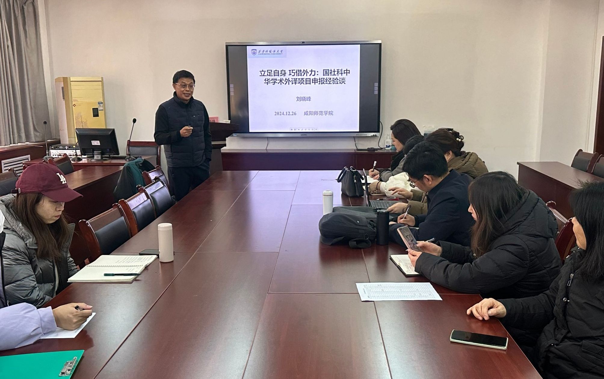 12月26日下午,北京外国语大学博士,西安外国语大学教授,翻译研究中心主任,英文学院翻译系主任刘晓峰教授应邀到我院做学术报告,报告内容为“立足自身,巧借外力:国家社科基金中华学术外译项目申报经验谈”及“无本译写:一个亟待开发的翻译研究领域”。