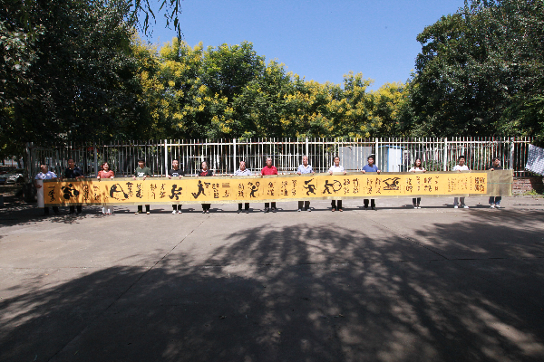 在参观金文长卷之际,校园里路过的学生们也纷纷跑来欣赏作品,并与老师和校友们合影留念,大家共同祝愿十四运圆满成功举办。