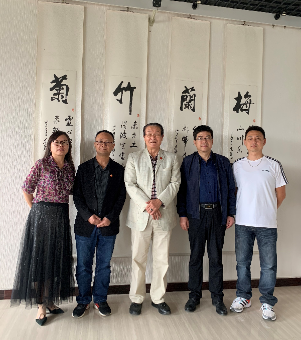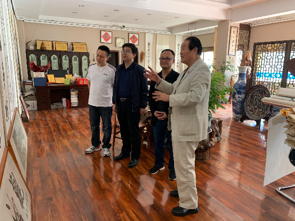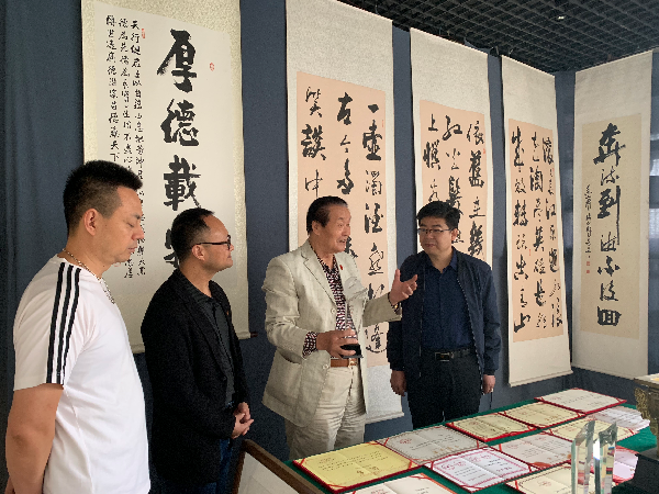 座谈之余,张老师带领我们参观了他的部分作品,并为我们讲解了毛主席诗词《沁园春·雪》、“厚德载物”、“梅兰竹菊”、“无欲则刚”等书法作品的创作历程。看到满桌的荣誉证书,一屋的书香墨宝,我们被这位80岁高龄老人深深震撼。在书法艺术的追求上,张老师每日书写作品,从不间断;在对社会的贡献上,张老师热心公益,扶贫帮困,得到他帮助的人很多很多;在顽强的个人意志上,张老师80岁高龄,精神矍铄,与癌症病魔抗争16年,更是令人赞佩!