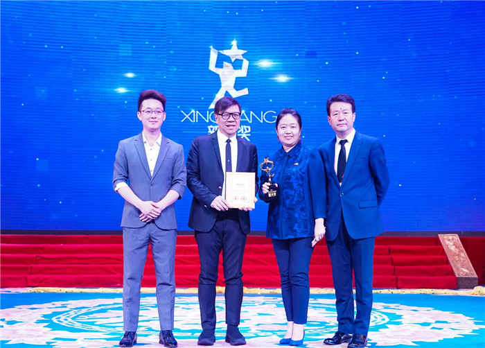 出品方代表中影动画宋薇薇(右2)制片人何钦(右1)、陈玉基导演(左2)、编剧廖飞宇(左1)在颁奖典礼上
