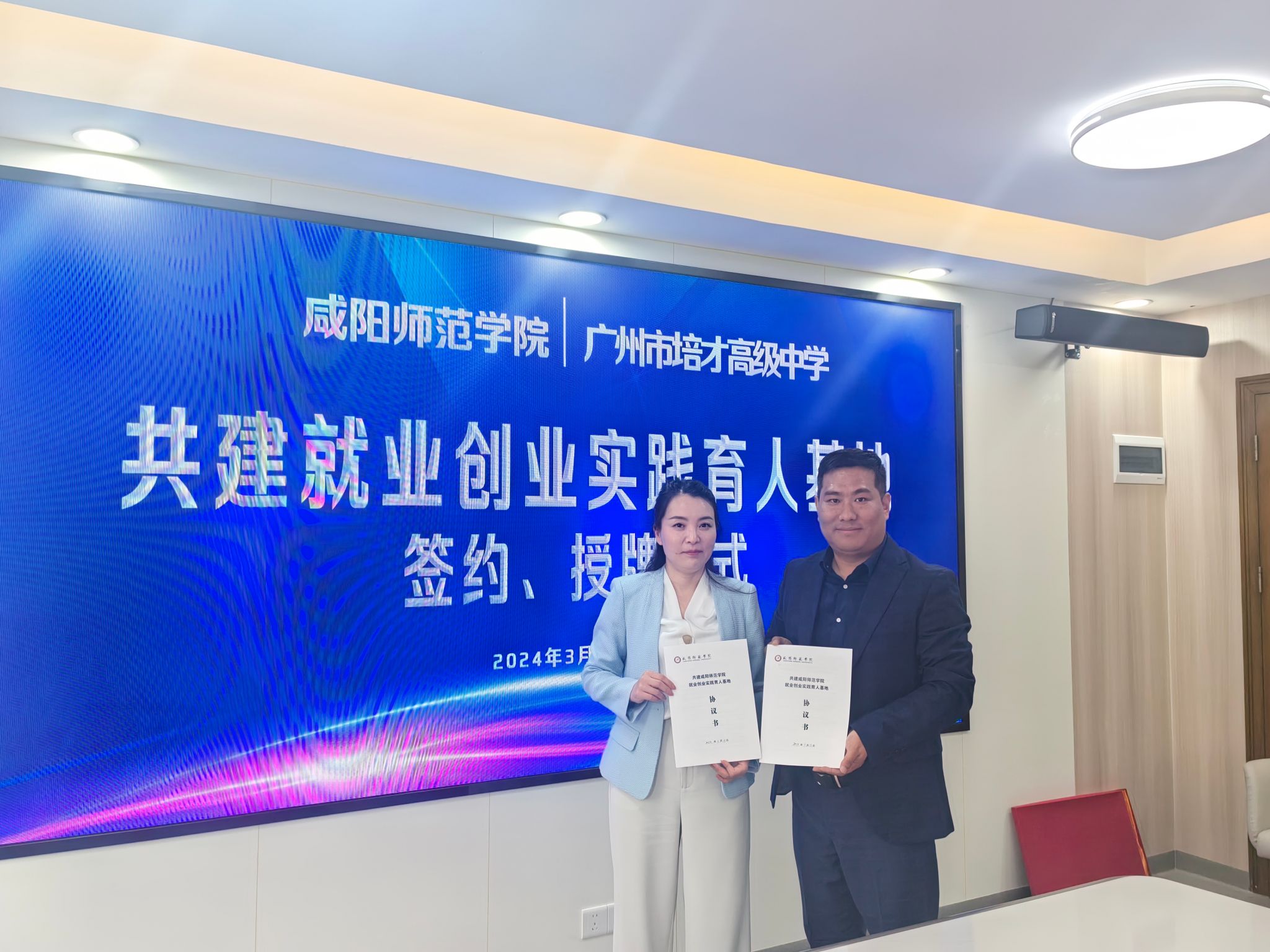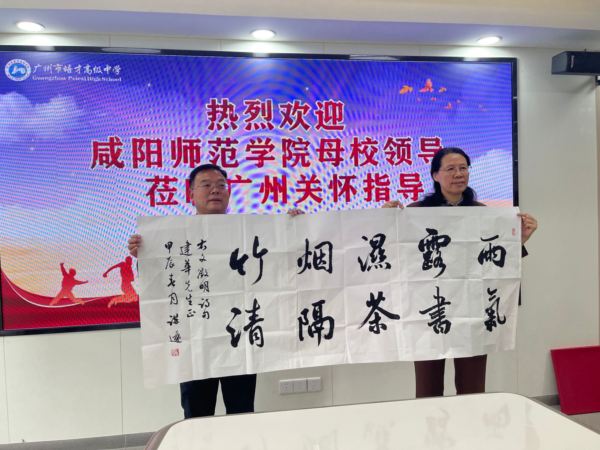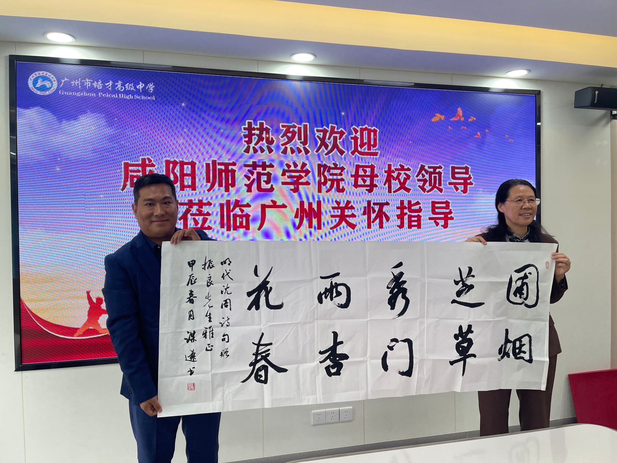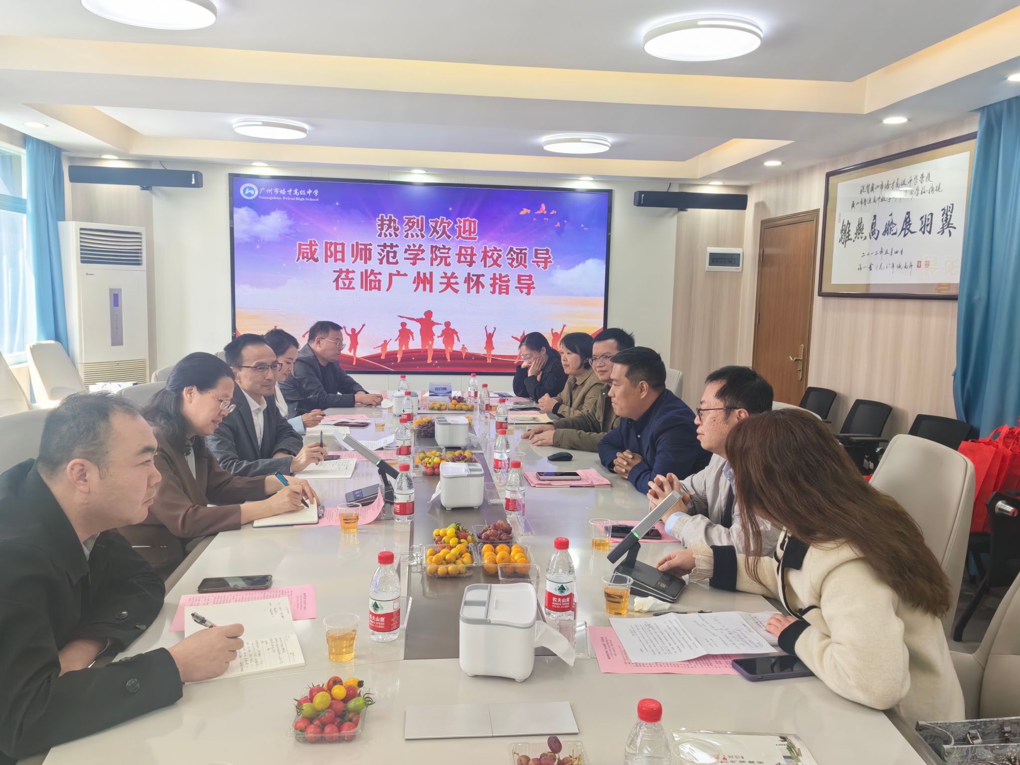 3月13日上午,在广州市培才高级中学,taptap点点2006届数学系校友、培才高级中学党支部副书记、副校长黄振良欢迎周群英一行前来广州交流调研,黄振良介绍了广州市培才高级中学的发展历程、教育教学成果、教师招聘等基本情况;回忆了当年在母校学习生活的难忘经历和母校恩师的悉心教导,以及受厚德博学校训浸润养成的踏实肯干、认真负责、爱校爱生的优秀品德。黄振良表示母校一定是人生最美好的回忆之一,是人生翱翔的起点,是人生路上的明灯。母校老师辛勤耕耘、无私奉献,教授学生知识、培养能力和锤炼品格,为每一位学生的青春之路鼓足干劲、指明方向,感谢母校和老师的教育培养。希望和母校在大学生实习实训、人才招聘、就业创业及科研项目等领域深度合作,回馈母校教育培养,共建共享共赢。双方代表签订了《taptap点点官网共建就业创业实践育人基地协议书》。周群英、黄振良共同为“就业创业实践育人基地”揭牌。并为校友代表杜建华、黄振良赠送了书法作品。