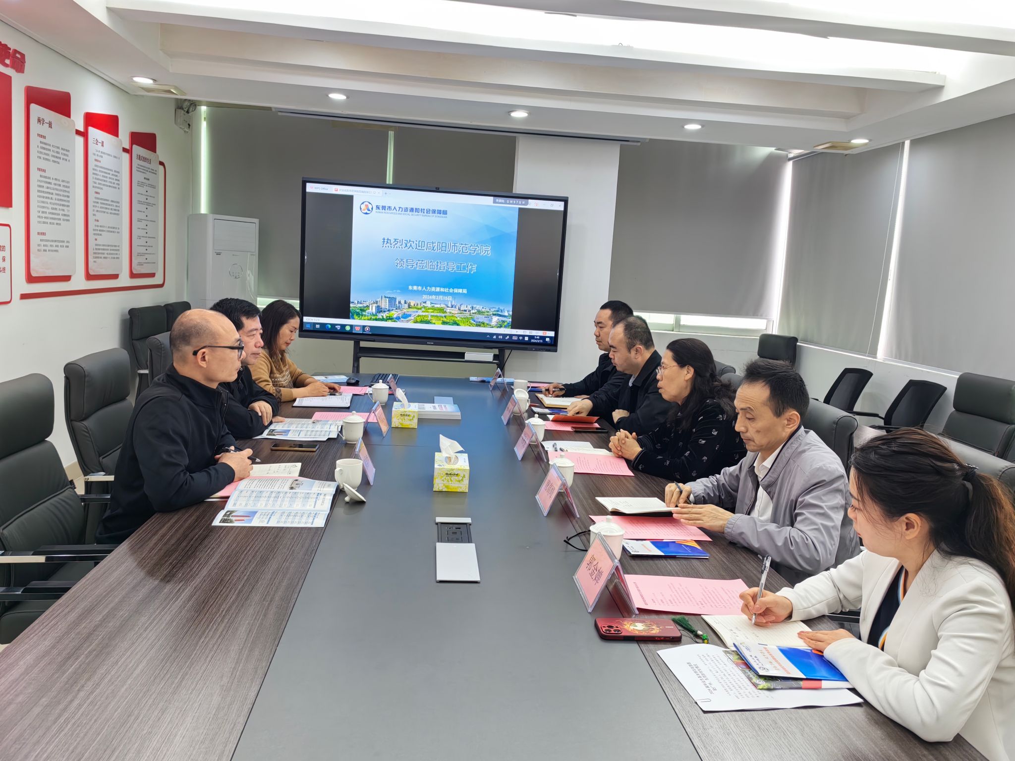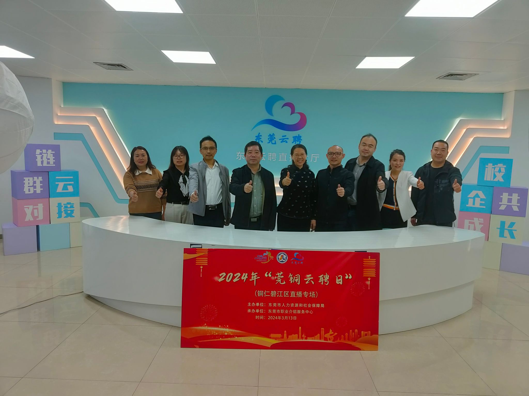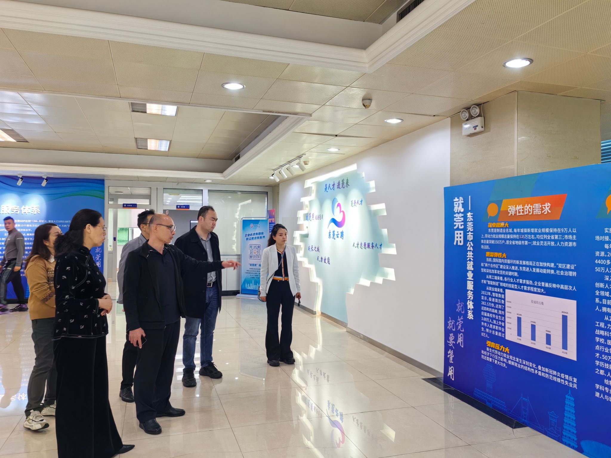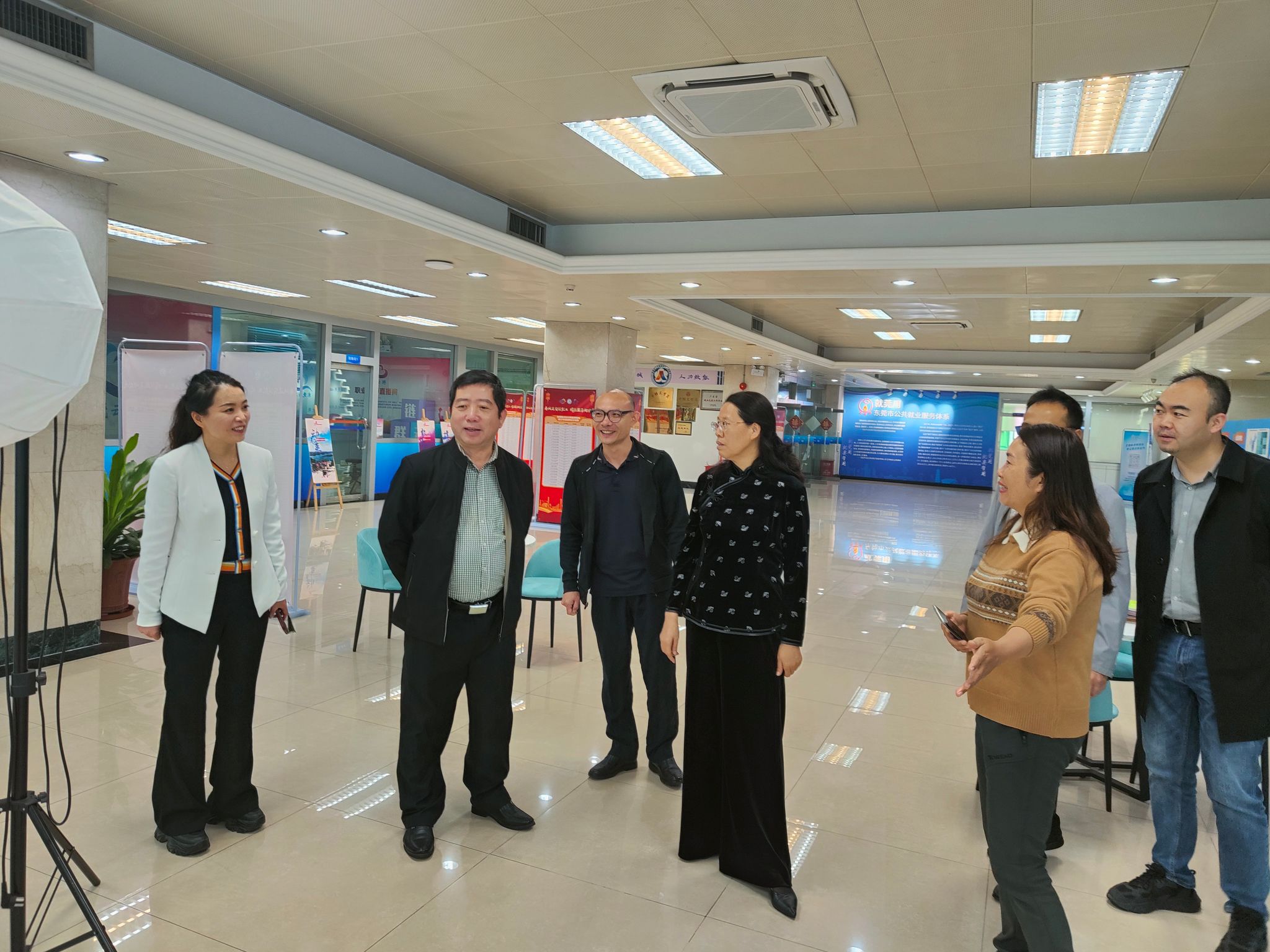 3月15日上午,周群英一行前往东莞市人力资源和社会保障局访企拓岗、交流调研。该局四级调研员侯首文、东莞市职业介绍服务中心副主任赖润坤、主任职员王君梅参加交流座谈。双方围绕东莞人才招聘需求、就“莞”用工厂招聘等就业新举措、校企校地合作、共建就业创业实习实践育人基地等方面展开深度交流。并参观了“东莞云聘”直播大厅,详细了解了“就莞用--东莞市公共就业服务体系”和云聘直播平台的操作流程及招聘成效。双方共同观看了“东莞城市宣传片”和“taptap点点官网宣传片”。会后周群英一行还会见了东莞市职业介绍服务中心主任叶桂兴。