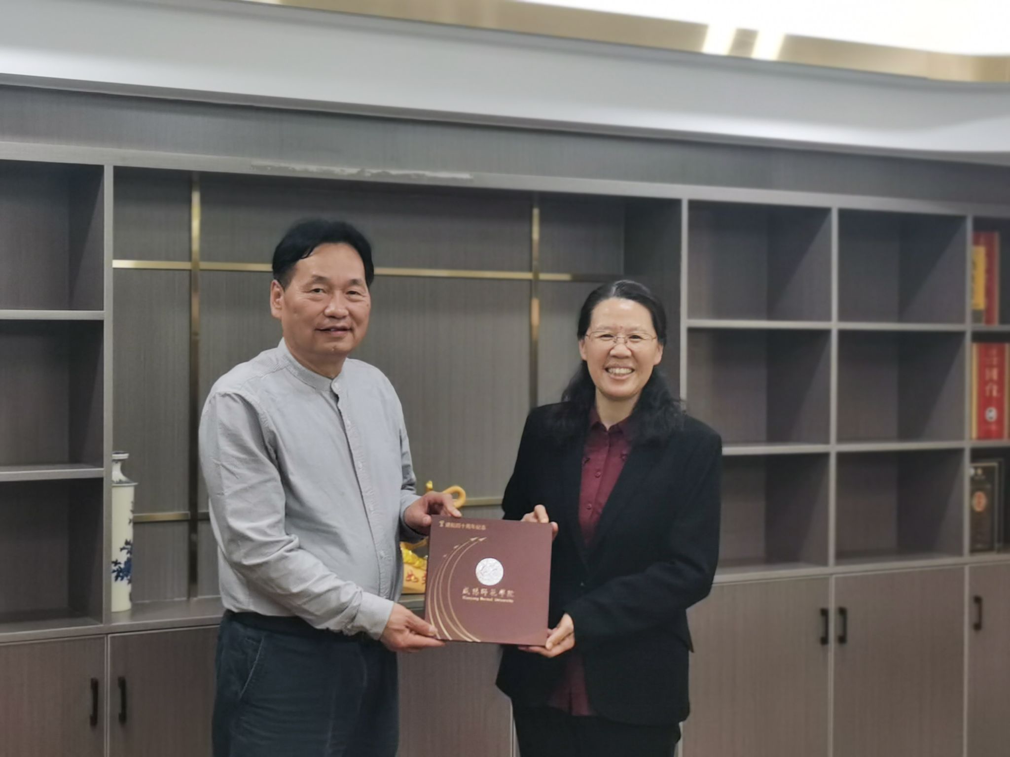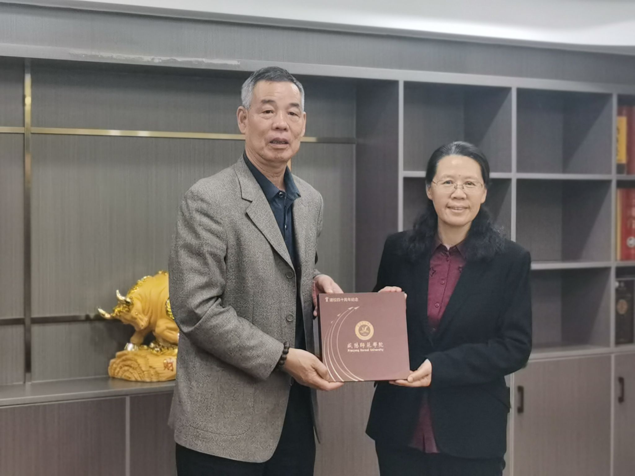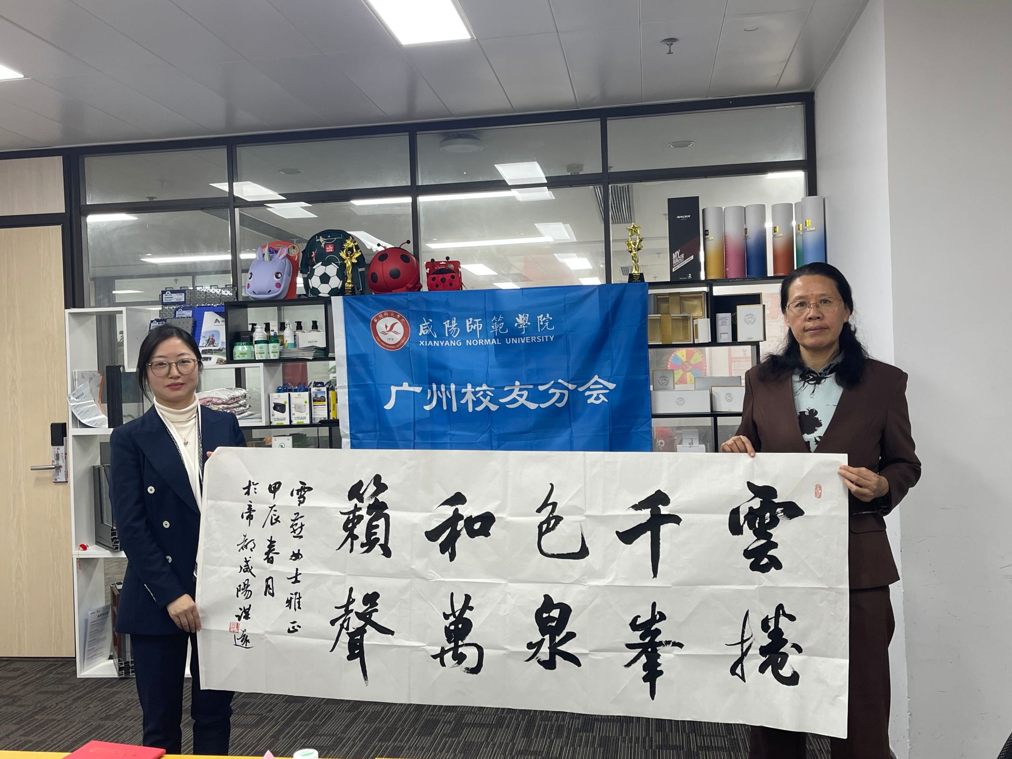 下午,周群英一行参观了广州翰客控股有限公司,召开了广州校友代表座谈会。2009届公共事业管理专业校友、广州翰客联合创始人王雪燕欢迎母校领导一行前来广州访企拓岗、看望校友,她回忆了母校学习生活经历,介绍了自己就业创业历程、企业发展业务运营和员工招聘需求等,期待与母校在实践实习、就业创业和公益事业等方面达成合作。受邀参加座谈会的校友代表有广州福源医药经理靳光辉、广州市华耀文化艺术有限公司德育校长肖冲等8位校友。大家就母校发展建设、广州人才需求、毕业生就业意识创新等交流探讨。会上王雪燕汇报了2020年底广州校友会线上成立以来,在紧密联络广州校友、爱心公益捐赠、为母校校庆送祝福、校友联谊沙龙等方面做出的成绩。会议新增选了黄振良、靳光辉等校友任副会长、副秘书长。周群英副书记宣布广州校友会正式成立,并授予会旗,为班子成员颁发了聘书, 向广州校友会会长赠送了书法作品。