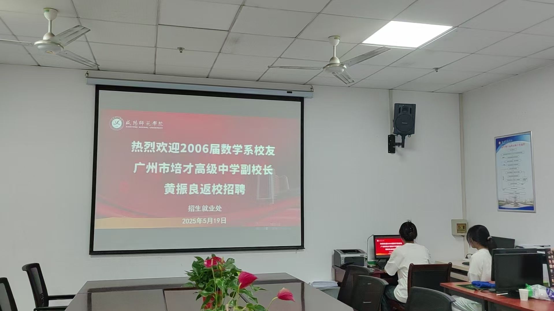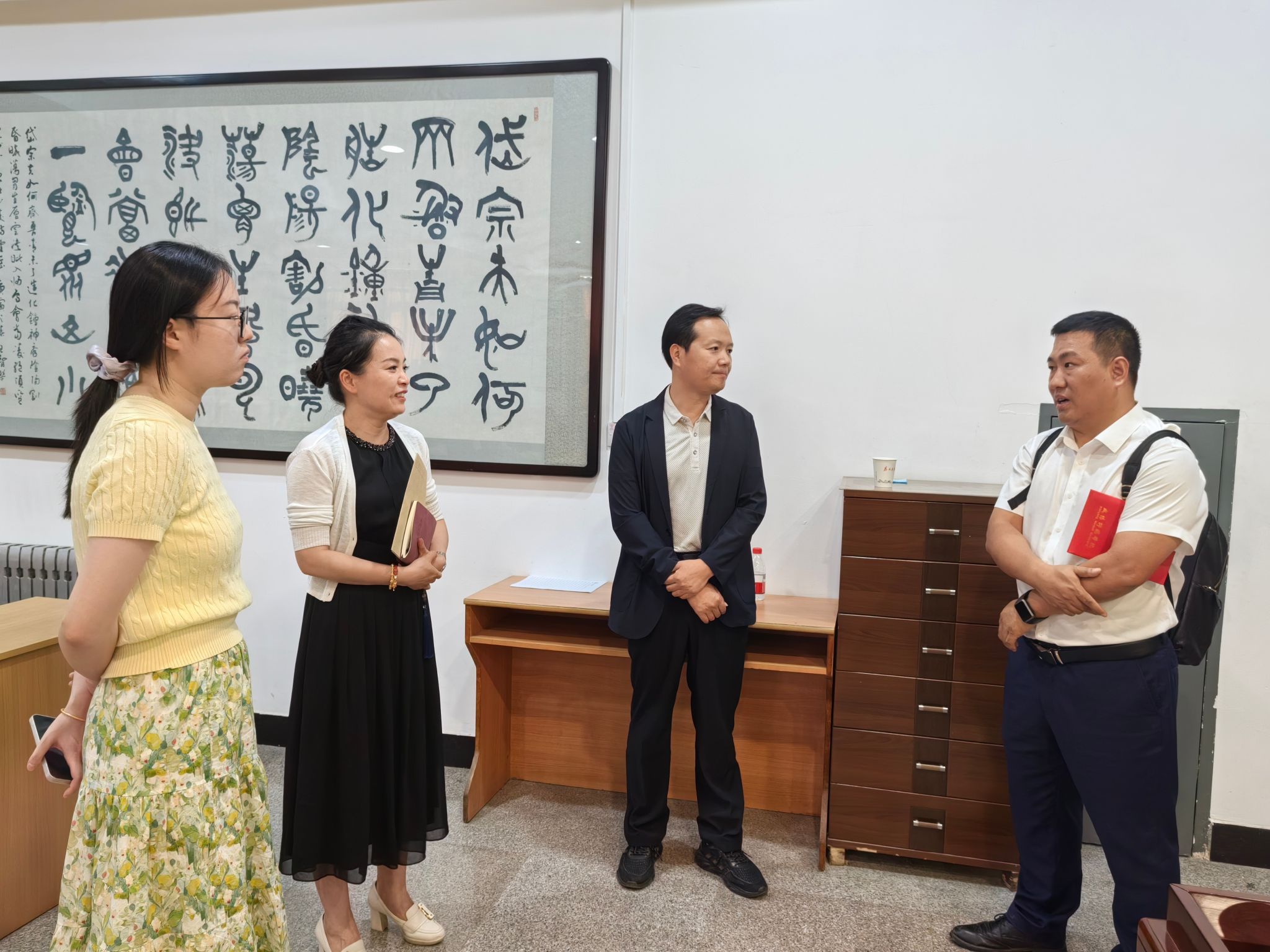 为充分发挥优秀校友的榜样引领作用,帮助在校大学生明确职业规划和发展,5月19日,数学与统计学院邀请2006届数学系优秀校友、广州市培才高级中学副校长黄振良返校作报告。报告会前,招生就业处处长、校友总会秘书长王奥玲,数学与统计学院党委书记唐高峰,辅导员王文民老师亲切会见了黄振良校友。